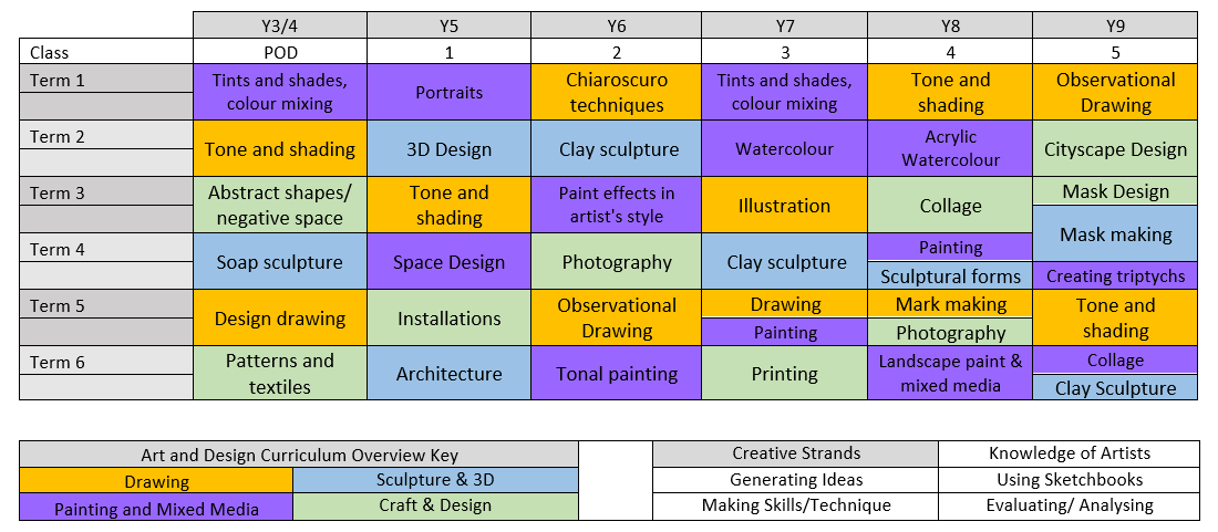 Students will be given the opportunity and encouraged to use different media for example: pencil, pastels, paint, fabrics and a range of 3D mediums through the curriculum delivery. They will have termly topics to experiment with different media and develop mastery skills and confidence in using them. Students will understand the importance of a sketchbook, to tell the story of their ideas. They will study a range of artis and art movements and build an understanding of historical and cultural developments linked different art forms. Pupils will have opportunities discuss the work of different artists and evaluate the merits of different art movements, helping them form their own opinions and appreciation of art and design.